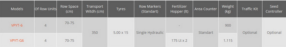 -Coulter Type Row Units – Standart metal or plastic fertilizer hopper. – Single Hydraulic Row Markers – Coulter Type Fertilizer Tines – 2 set of seeding disc – PTO Shaft (Can be chosen octagonal or hexagonal input ) – Area Counter